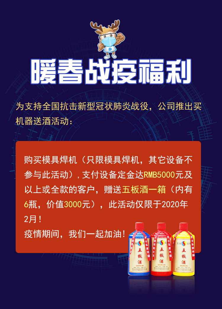 新型冠狀肺炎戰(zhàn)役福利——買通發(fā)激光模具焊接機(jī)送五板酒