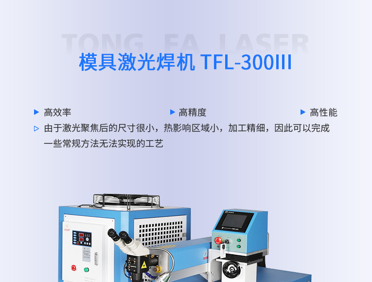 通發(fā)激光TFL-300Ⅲ大功率模具激光焊機,比普通激光焊機修復模具效率快1.5-2倍,適合0.3-0.6激光焊絲,大功率更適合修復鈹銅模具、鋁模等較難修復的模具。