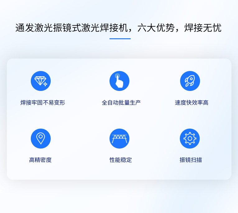 1、采用高速掃描振鏡進行激光定位,速度可達(dá)7000mm/s,極大的降低了焊接位置之間的空走時間,從而大大的提高生產(chǎn)效率;